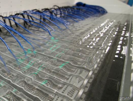 不同于普通机架的一层一层的结构,在矿物油冷却系统的机架中,服务器是类似刀片的插入到矿物油中。