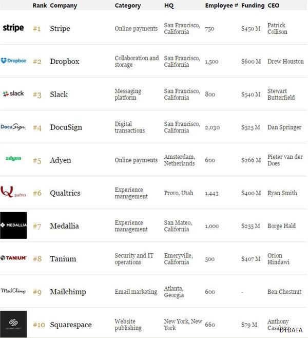这份榜单中硅谷企业阵容强大。除了Stripe,另外3家旧金山企业也牢牢占据了该榜前4名的位置:文件共享和协作公司Dropbox排名第二,消息平台Slack位列第三,数字签名独家兽DocuSign居于第四。