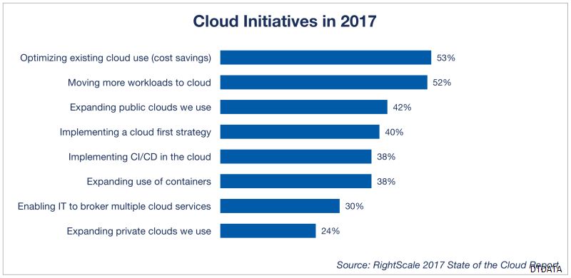 这增加了对成本的担忧,优化云成本是2017年所有云用户(53%)的首要举措,特别是成熟云端用户(64%)。