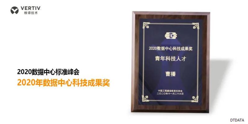 同时在本次大会上,维谛技术(Vertiv)有限公司服务产品部高级总监曹播还荣获了由中国工程建设标准化协会颁发的“2020数据中心科技成果奖--青年科技人才”奖。